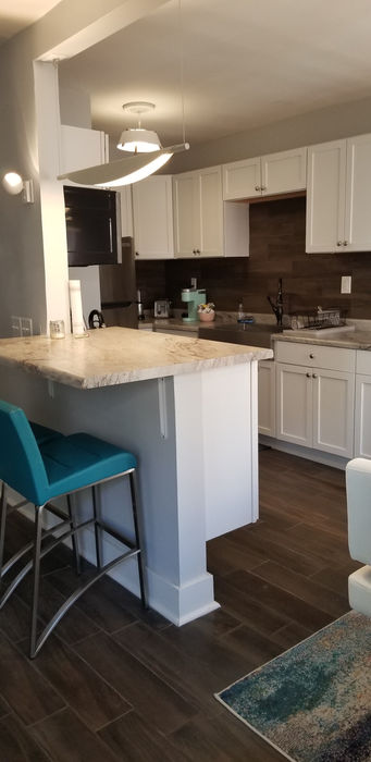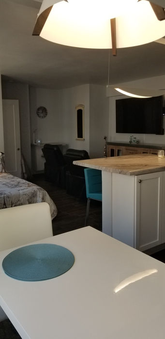 Hardwood floors, king-size bed, full-size kitchen fully-equipped with dishes, silverware and everything you need to prepare meals, dinette area with table and chairs, closet, desk/chair, and more. 430 square feet