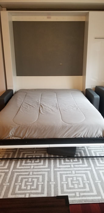 Newly-renovated Studio condo with full-sized kitchen with granite countertop, new stainless steel appliances including dishwasher, stove, refrigerator and microwave. Wood floors, Desk/Office space, Coffee Bar, Bathroom completely redone too. Fully furnished including Queen size Murphy bed, 50-inch smart TV and more. There is a HUGE walk-in closet with custom-closet system and in-unit washer and dryer. Everything is provided Towels, linens, dishes, silverware, pots/pans and more.