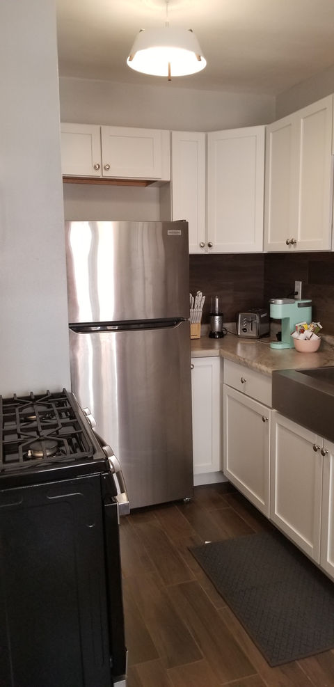 Hardwood floors, king-size bed, full-size kitchen fully-equipped with dishes, silverware and everything you need to prepare meals, dinette area with table and chairs, closet, desk/chair, and more. 430 square feet