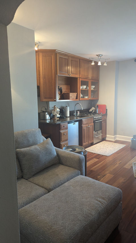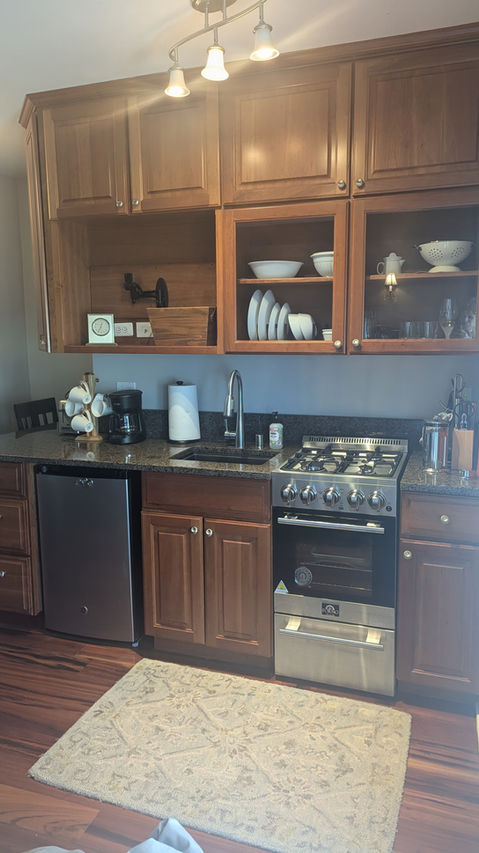 Tiny-living at its best! Fully-renovated condo with hardwood floors, king-size bed, small-size kitchen with custom Italian kitchen with brand new stainless steel appliances, 2-person dinette bar & chairs, sitting area, closet, king size bed, TV and more. 390 square feet
